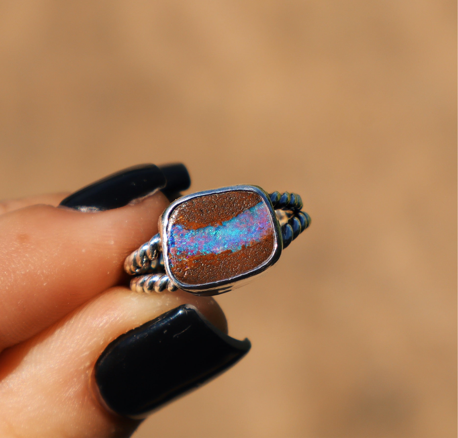 Blue purple river boulder opal ring double rope band, size US 5.5