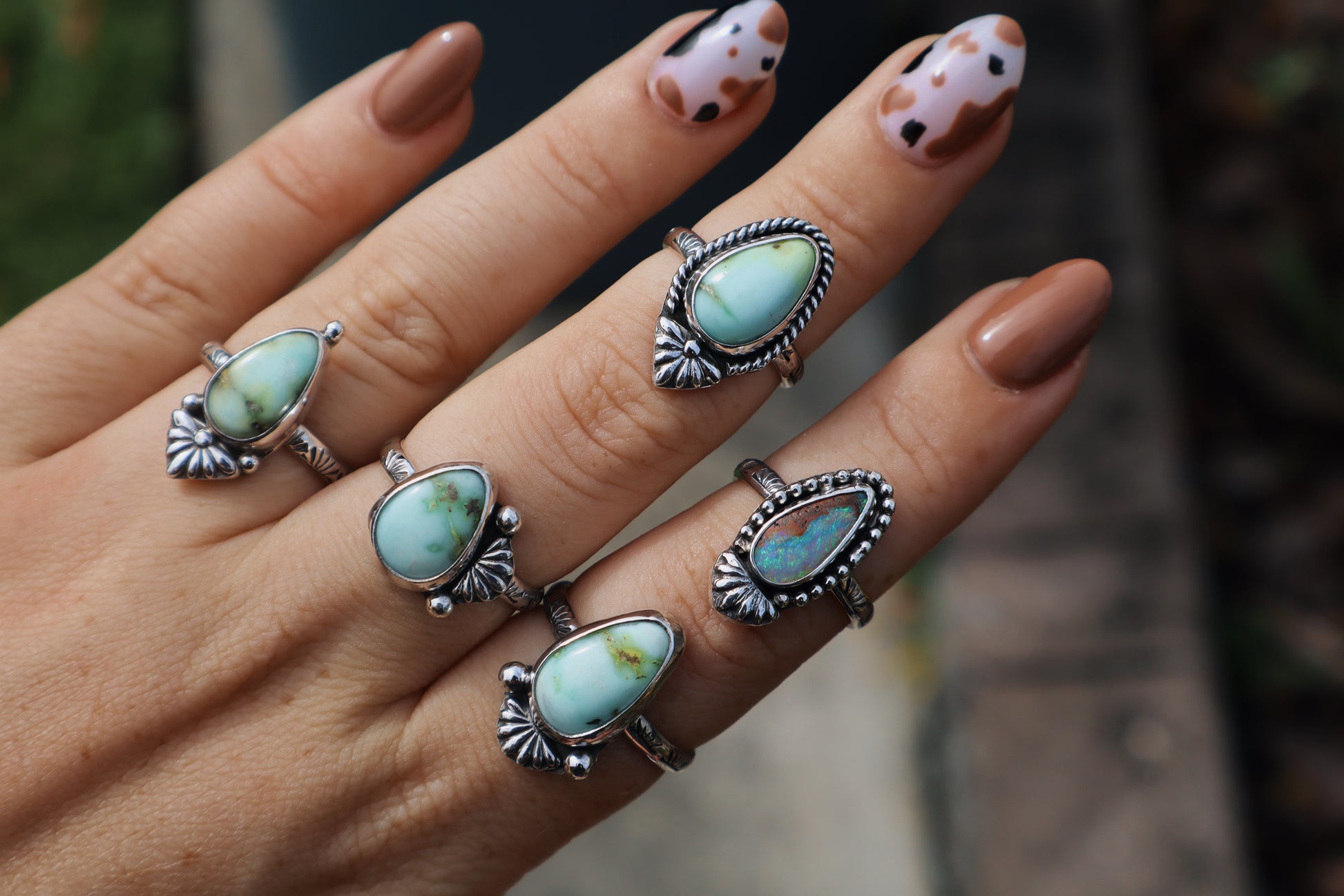 Palomino Cactus flower ring, size 8 hand stamped band, sterling silver