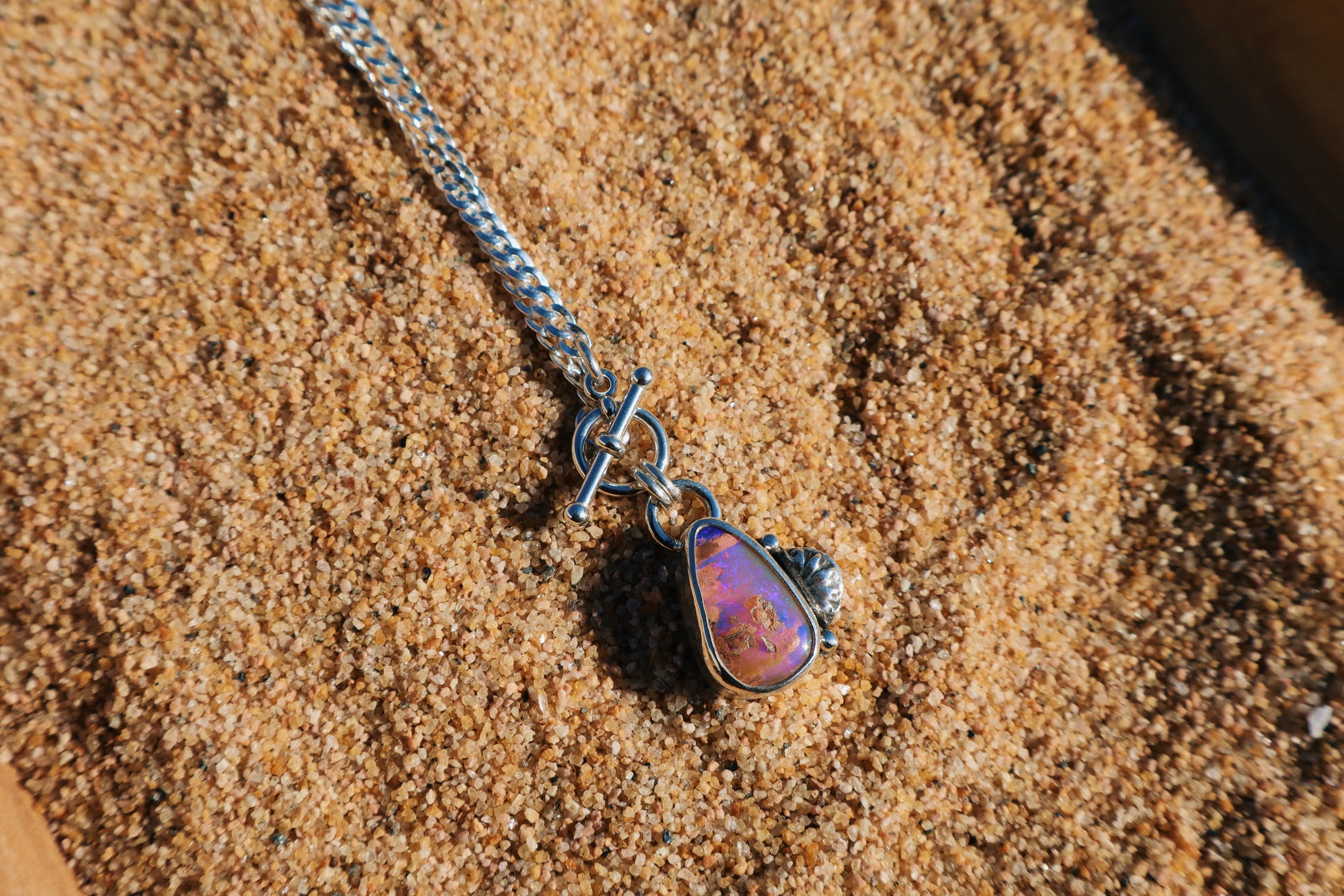 This one-of-a-kind pendant features a stunning natural purple boulder opal, alive with soft flashes of pink, violet, and earthy undertones unique to Australian boulder opal. Each stone is completely natural and left just as it formed, making this piece truly one of a kind.