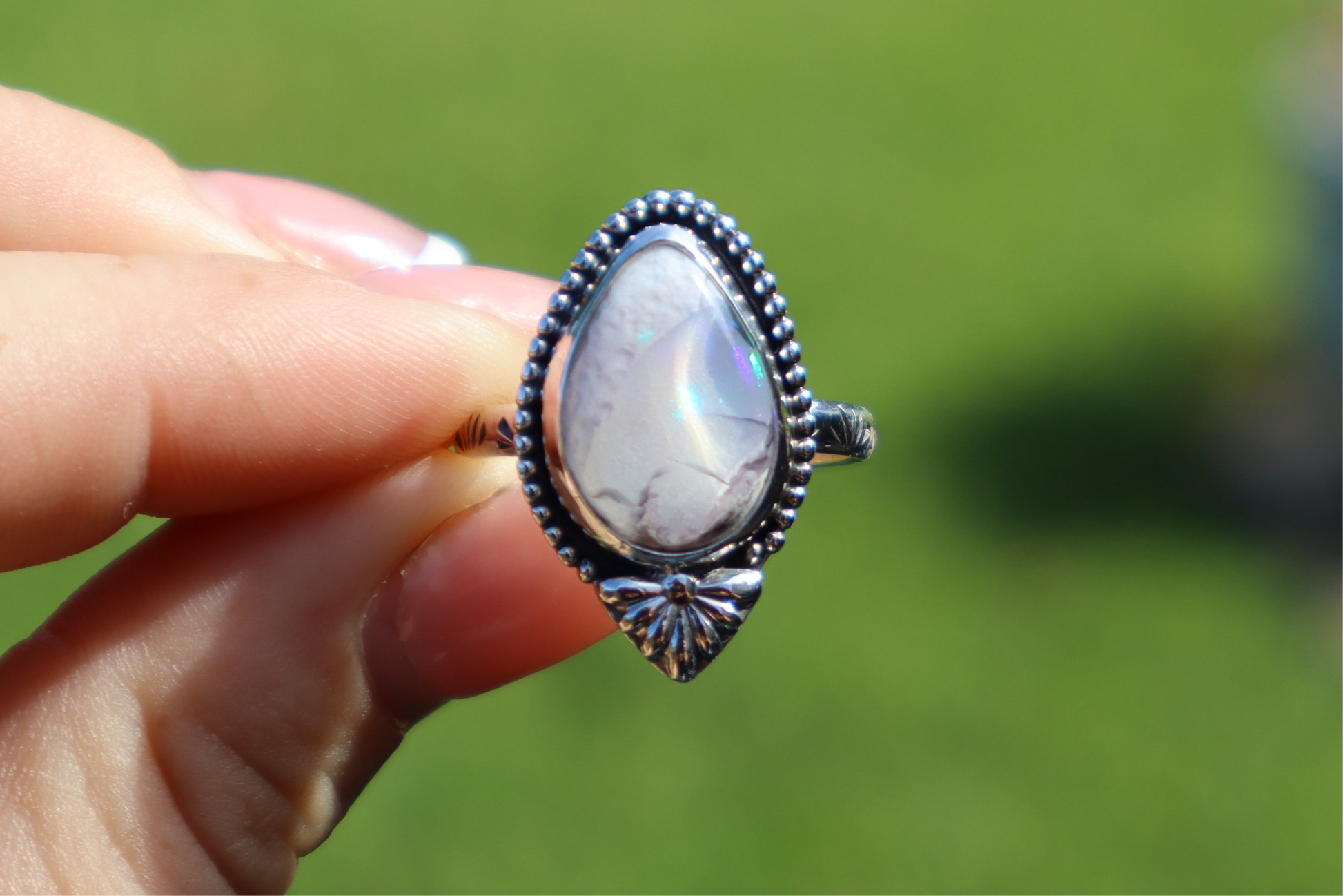 White Flashy Mexican opal “White Magnolia” Ring. Size 9