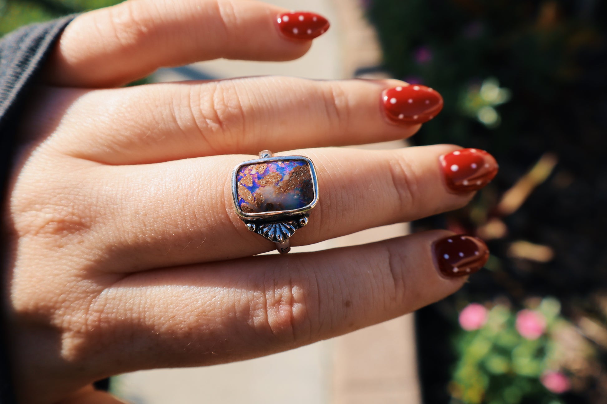 This ring features a Solid untreated Boulder opal/ wood replacement stone.
